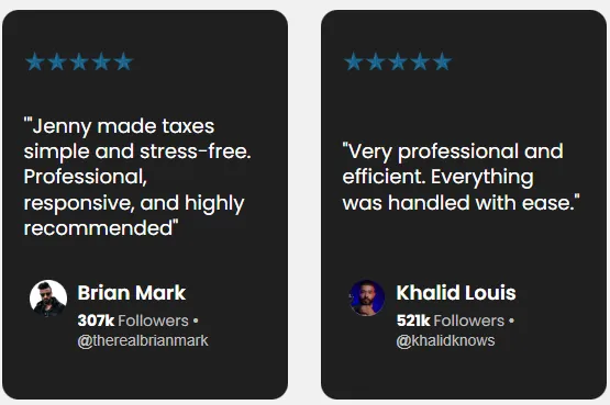 "I’ve been going to Jenny for 3 years now. She has been nothing but trustworthy, reliable, and easily accessible when you have questions. I reside in a different state than Jenny, and I was a little nervous about working with someone on my taxes that wasn’t close by. Easily one of the best choices I’ve ever made working with Jenny."